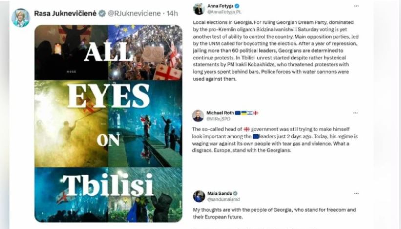 ლიეტუველმა ევროპარლამენტარმა რასა იუკნევიჩიენემ გამოაქვეყნა ძალადობრივი პროტესტის ფოტოებისგან შემდგარი ბანერი წარწერით: “ყველას მზერა თბილისისკენაა მიმართული”, მანამდე კი, იუკნევიჩიენე წერდა: “საქართველოს სჭირდება ჩვენი ყურადღება და მხარდაჭერა. დღეს ერთ-ერთი ყველაზე მნიშვნელოვანი საპროტესტო აქცია იმართება ევროპული საქართველოსთვის”.